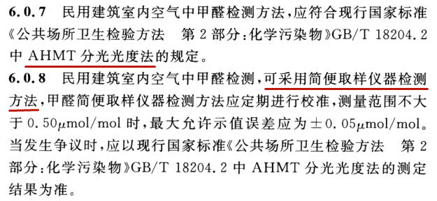 甲醛檢測允許使用經(jīng)過定期校準(zhǔn)的便攜式檢測儀進(jìn)行檢測,當(dāng)發(fā)生爭議時,應(yīng)以現(xiàn)行國家標(biāo)準(zhǔn)GB/T18204.2中AHMT分光光度法的測定結(jié)果為準(zhǔn)。