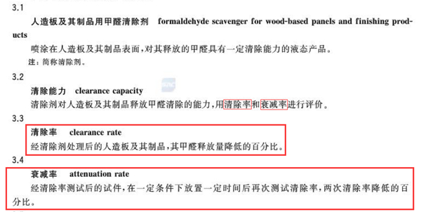 根據(jù)國家標(biāo)準(zhǔn),驗(yàn)證人造板甲醛清除劑的清除能力有兩個(gè)指標(biāo)非常重要,一個(gè)是測定24小時(shí)效果的“甲醛清除率”,還有一個(gè)測定長期效果的“衰減率”?!八p率”就是在7天之后,再測一次甲醛清除率,然后把7天后的甲醛清除率與24小時(shí)的甲醛清除率作比較,看7天后清除甲醛的效果降低了多少,計(jì)算出來的降低比率就是“衰減率”。