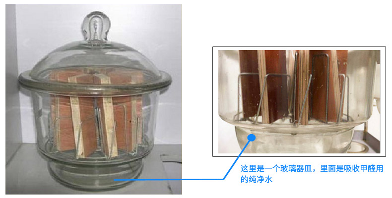 你看看上面那張表,表中的《人造板及其制品用甲醛清除劑清除能力的測試方法》,這個(gè)方法是檢測人造板甲醛釋放量方法,專業(yè)上稱之為“干燥器法”。就是把10塊切割成15cm×5cm的人造板,放到這個(gè)10升的玻璃容器里,密閉24小時(shí)。24小時(shí)中,人造板不停地釋放甲醛,在玻璃容器的底部,放著一個(gè)盛著純凈水的玻璃器皿,人造板釋放出來的甲醛被吸收在水中,然后檢測水中的甲醛,所得數(shù)值就是人造板甲醛釋放量。