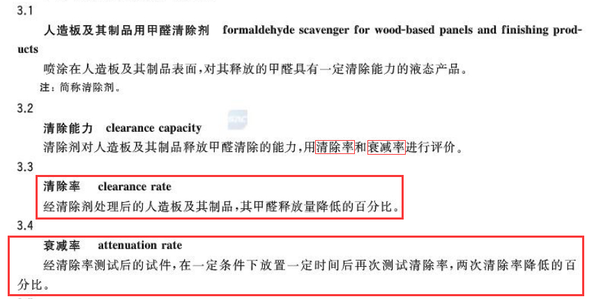根據(jù)國(guó)家標(biāo)準(zhǔn),驗(yàn)證人造板甲醛清除劑的清除能力的有兩個(gè)指標(biāo)非常重要,一個(gè)是測(cè)定24小時(shí)效果的“甲醛清除率”,還有一個(gè)測(cè)定長(zhǎng)期效果的“衰減率”?!八p率”就是在7天之后,再測(cè)一次甲醛清除率,然后把7天后的甲醛清除率與24小時(shí)的甲醛清除率作比較,看前后兩次清除甲醛的效果降低了多少,計(jì)算出來(lái)的降低比率就是“衰減率”。